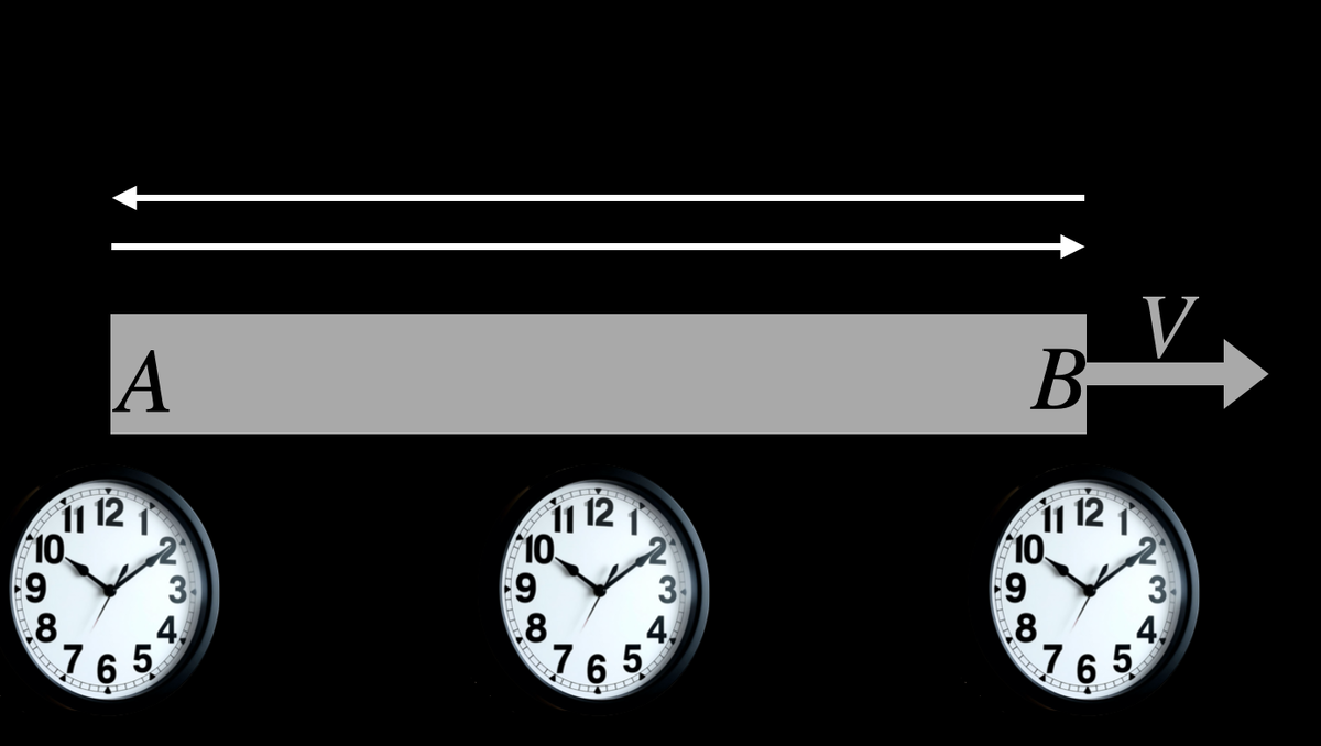 если t(b) — t(a) = t’(a) — t(b), то часы А и В идут синхронно. Этот метод позволяет установить согласованность хода часов в разных местах и даёт возможность говорить об одновременности событий в пространстве. В неподвижной системе отсчёта данный способ действительно обеспечивает идеальную синхронизацию и гарантирует одинаковый ход часов А и В. Однако, что произойдёт, если применить тот же самый метод на движущемся стержне? Рассмотрим случай, который исследует Эйнштейн, когда стержень движется вдоль оси ОХ с постоянной скоростью V относительно неподвижной системы отсчета. Тогда получается следующее: Время прохождения сигнала от точки А к точке В составляет: