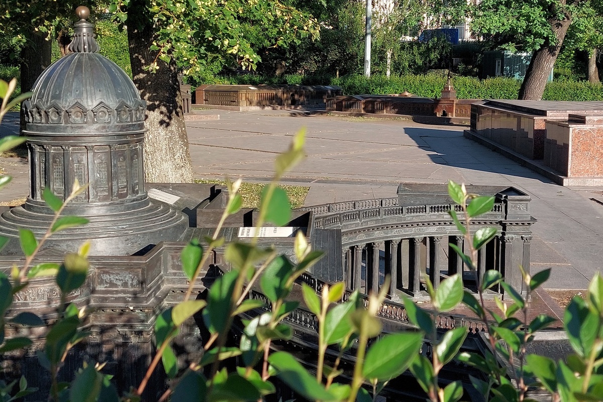 Начинается ваша прогулка возле макета центра Санкт-Петербурга. Здесь вы можете как бы с высоты птичьего полёта увидеть город, каким его мечтал увидеть Петр I. Хорошо просматриваются острова, на которых город располагается, реки, главные здания. Здесь же рядом сидит апостол Пётр, имя которого носит город на Неве, а напротив заседают архитекторы, которые город строили.