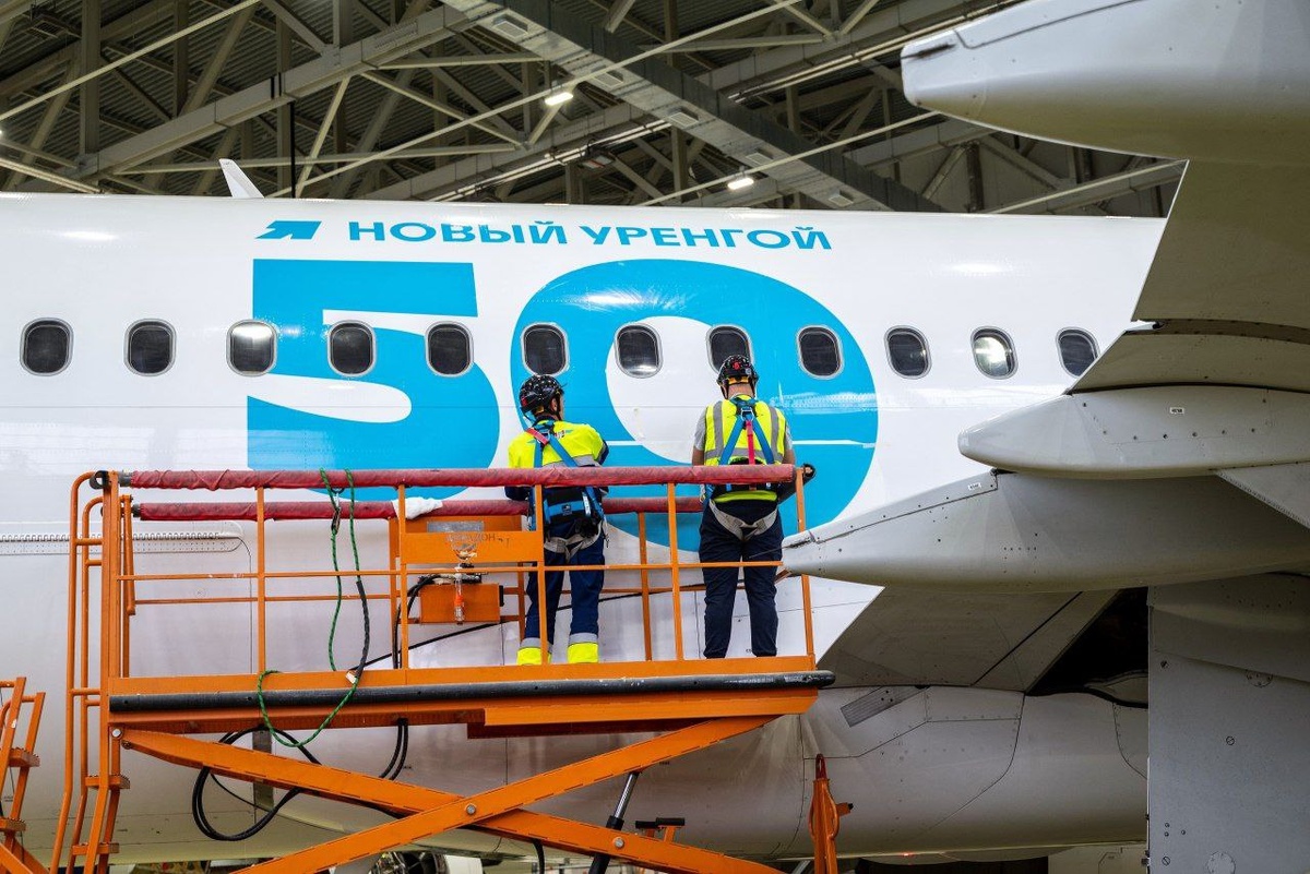 В честь юбилея газовой столицы самолёт Airbus A320 авиакомпании «Ямал» украсили впечатляющей бело-голубой надписью — «50 лет Новому