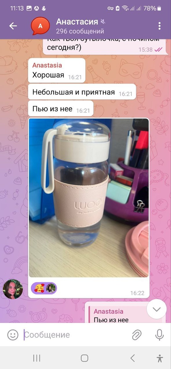 История одной бутылки... 17 мая 11:00 провожу созвон в группе, расказываю про важность стеклянной тары, особенно летом, в жаркое время года. То есть мы пьем не в пластиковых, а стеклянных бутылках Слышу возражение участницы, что это неудобно, тяжело в метро носить итд... 17 мая 18:49 участница заказала бутылку (смотрите скриншот😃) 21 мая бутылочка пришла 22 уже была на работе с положительным отзывом А потом бутылок стало уже 2, другая участница себе ее тоже заказала😊😊 Почему стекло, а не пластик рассказывала здесь Там очень внушительный список, обязательно посмотрите💯 Мораль сей басни такова... В начале мозг сопротивляется всегда))