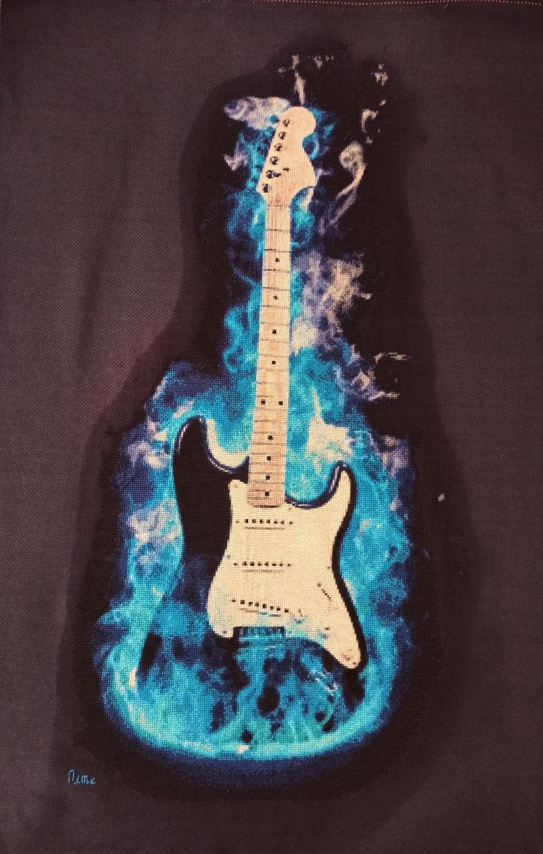 Всем привет! Меня зовут Наташа, и я с огромным удовольствием занимаюсь вышивкой. Рада представить вашему вниманию свой дневник вышивальщицы. В мае я завершила одну из своих крупных работ, которую вы все знаете. За время нашего общения она успела изрядно надоесть. Сегодня я хочу восстановить весь процесс вышивки, хотя это задача не из легких. Все началось с соцсетей. Я увидела страницу «Химера вышивка крестом. Авторские схемы» и увидела там интересную схему. Тогда мой сын только начинал учиться играть на гитаре, и идея пришла сама собой. Не раздумывая долго, я купила схему и начала готовиться. От вышивки фона я сразу отказалась и искала темную основу. Спасибо маркетплейсам за огромный выбор товаров для вышивки. Сначала я купила большой отрез черной канвы, но потом увидела темно-синюю и решила, что она тоже подойдет. Основу я выбрала Аида от «Гаммы» 14 каунта. Затем нужно было определиться с нитками. У одного из блогеров я услышала о девушке Альбине и ее группе «Ниточка-иголочка». Работа