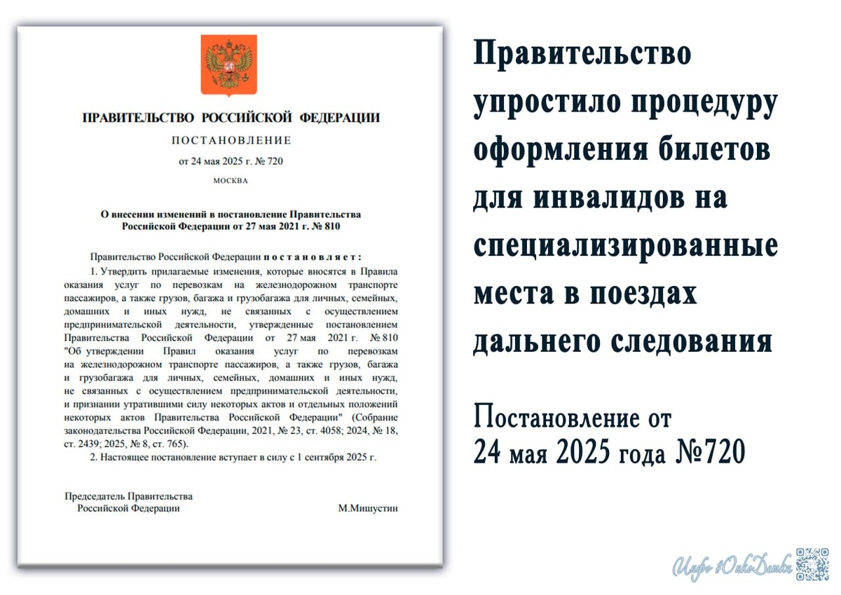 Упрощение оформления билетов для граждан с инвалидностью на специализированные места в поездах дальнего следования Подписано Постановление Правительства Российской Федерации от 24 мая 2025 года № 720, которое упрощает порядок покупки билетов в купе, оборудованных с учётом особых потребностей пассажиров с инвалидностью. При покупке билетов через кассу на специализированные места теперь не требуется предъявлять бумажные документы, подтверждающие льготу. Достаточно предъявить документ, удостоверяющий личность, и сообщить номер СНИЛС. Все данные будут автоматически проверяться через государственную информационную систему «Единая централизованная цифровая платформа в социальной сфере». Аналогичный порядок уже действует при покупке электронных билетов через официальный сайт. Решение распространить такой упрощённый порядок на покупку билетов через кассу было поддержано общероссийской общественной организацией «Всероссийское общество инвалидов». Данное постановление вносит изменения в Пост