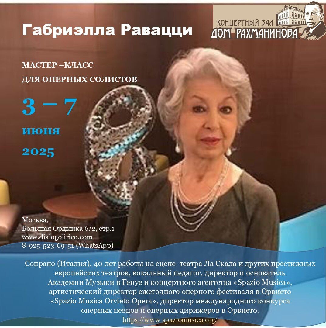 Мастер-классы для оперных певцов пройдут в концертном зале Московского музея С. В. Рахманинова с 3 по 7 июня 2025 года. Габриэлла Равацци – сопрано (Италия), мастер оперного искусства, обладательница совершенного слуха и голоса диапазоном в четыре октавы. Исполнила главные партии более чем в 130 операх на сценах престижных европейских театров: Ла Скала в Милане, Парижская опера, Римская опера, Арена ди Верона, Сан-Карло в Неаполе, Ля Фениче в Венеции и др. Является основателем и директором Академии Музыки в Генуе и концертного агентства "Spazio Musica". С 1978 года проводит и возглавляет ежегодный оперный фестиваль "Spazio Musica Orvieto Opera", который каждое лето собирает в Орвието талантливых музыкантов со всего мира и даёт путёвку на большую сцену многим молодым артистам. Каждый июль на протяжении уже многих лет в Орвието проходит конкурс для оперных солистов и оперных дирижёров. Имена её учеников украшают афиши престижных европейских театров среди которых есть и наши российски