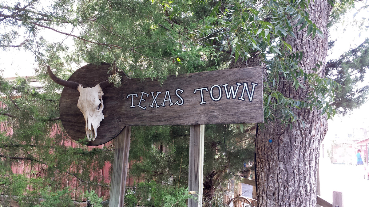 Обойдя весь зоопарк, мы подошли к арке с надписью "Texas Town". В этой части парка расположились строения, загоны для скота и другие атрибуты старого Техаса. Стоило только перейти довольно живописный ручей, отделяющий этот уголок от зоопарка, как попадаешь в атмосферу, напоминающую наши любимые в детстве фильмы про "дикий Запад". Ну, фильмы, скажем, были не американские, а гедеэровские, поэтому чтобы такие как мы могли ознакомиться с местной природой здесь много плакатов с описанием географии, геологии и животного мира штата.