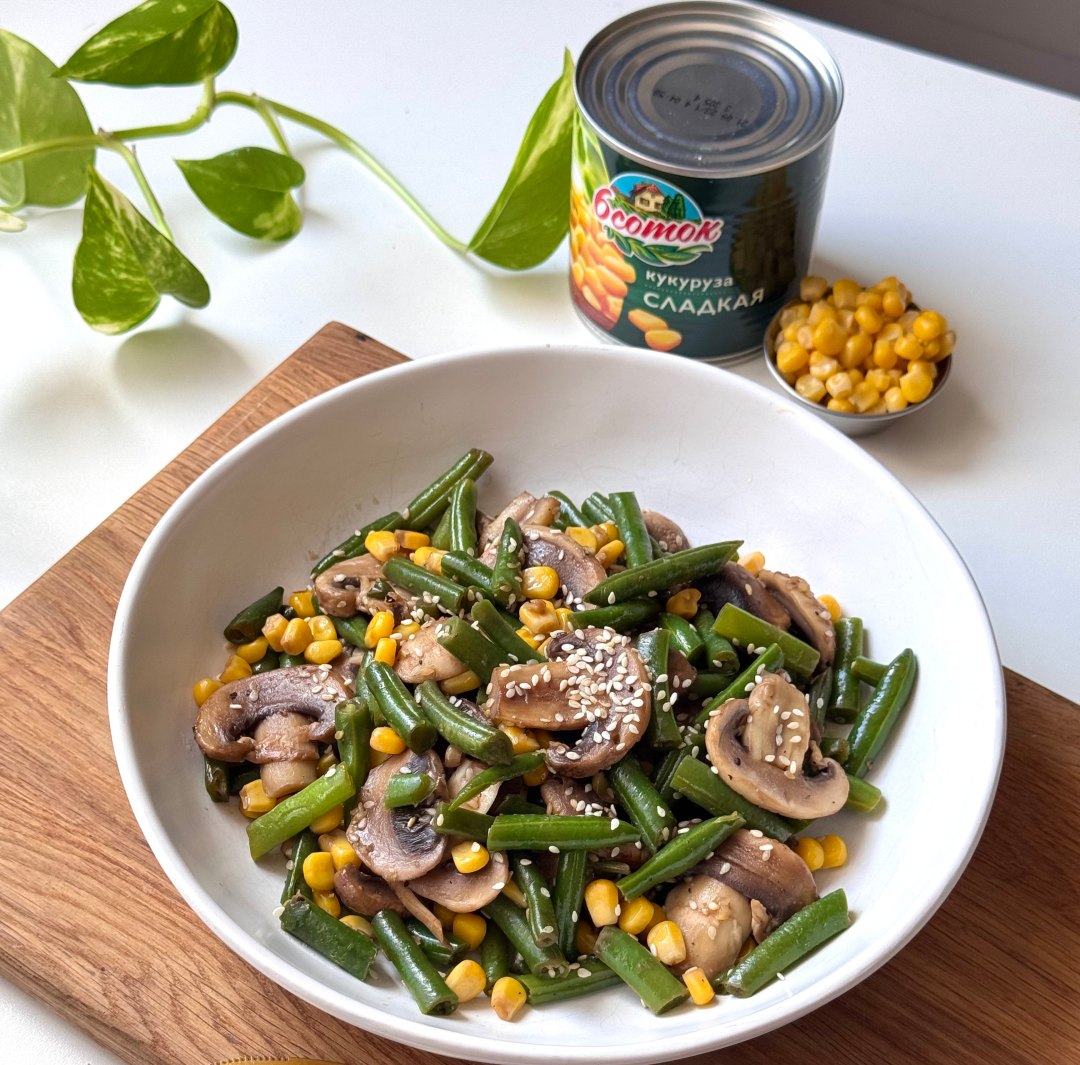 - К шампиньонам добавляем фасоль, пропущенный через пресс чеснок, соевый соус и черный перец. Перемешиваем.
