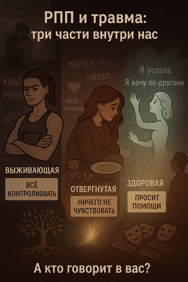 Когда человек переживает травму — особенно в детстве или в условиях хронической небезопасности — его психика может разделиться на несколько внутренних ролей. Это не болезнь, а способ выживания. Например, при РПП это разделение становится особенно заметным: 1. Выжившая часть — та, что взяла на себя всю ответственность за безопасность. Она придумала стратегии, чтобы как-то справляться с внутренней болью и тревогой. В случае РПП это может быть контроль над телом и едой: строгие диеты, переедания, очищения, навязчивые тренировки. Эта часть говорит: «Если я буду идеальной, меня будут любить. Если я буду худой, меня не тронут. Если я буду контролировать еду, я хоть что-то в жизни буду держать в руках». Эти стратегии работают — на короткое время. Поэтому они становятся жесткими, ригидными. Психика боится их отпускать — ведь на них держится чувство псевдобезопасности. 2. Отвергнутая часть — это то живое и спонтанное, что когда-то нельзя было проявлять. Это может быть голод — в буквальном и мет