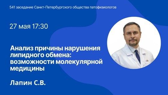 27 мая (вторник) 2025 года в 17:30 в зале Учёного Совета Первого Санкт-Петербургского государственного медицинского университета им. акад. И.П. Павлова состоится 541 заседание Санкт-Петербургского общества патофизиологов. ПОВЕСТКА ЗАСЕДАНИЯ: Доклад: «Анализ причины нарушения липидного обмена: возможности молекулярной медицины» Докладчик: Лапин Сергей Владимирович АННОТАЦИЯ ДОКЛАДА: Увеличение и изменение липидных фракций в плазме крови является важным компонентом развития атеросклеротического поражения сосудов. Выделяют первичные и вторичные дислипидемии, выявление которых требует биохимического, иммунохимического и генетического обследования. В докладе будет обсуждаться патофизиология нарушения обмена липидов при дислипидемиях и практические аспекты их выявления с позиций последних достижений молекулярной медицины. https://pathophysiology.ru/meetings/tpost/4fg1r7i381-541-zasedanie-sankt-peterburgskogo-obsch