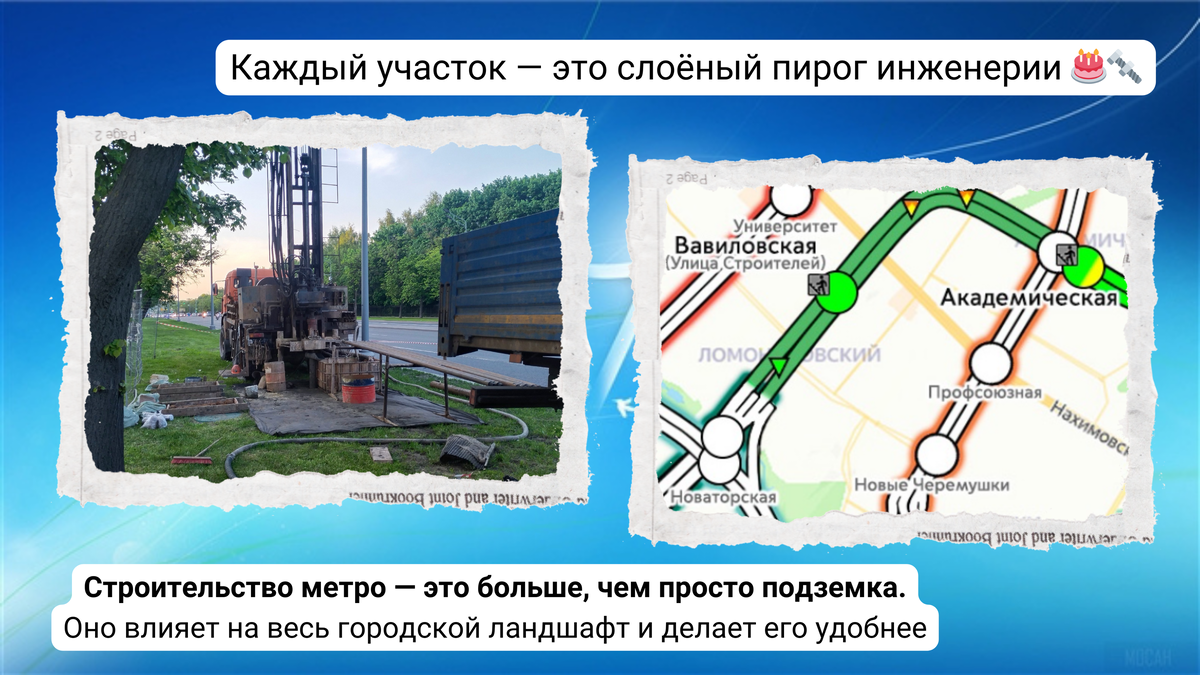 официальные отчеты. Давайте вместе разберемся, что же на самом деле происходит с нашей Москвой. Поехали? Во-первых, сообщаем, что около будущих тупиков за станцией «Липецкая» 🏭 Бирюлëвской линии активно ведутся геологоразведочные работы. Бурилки сдвинулись чуть южнее. Во-вторых, посмотрим на благоустройство у 🚇 «Вавиловская» (проектн. «Улица Строителей») 🏡Троицкой линии 📷 2.1-2.2: Благоустройство около дома по адресу Ленинский проспект, 83. 📷 2.3: Выход на поверхность южного вестибюля около дома 81 по Ленинскому проспекту. 📷 2.4: Благоустройство в створе улицы Панфёрова. 📷