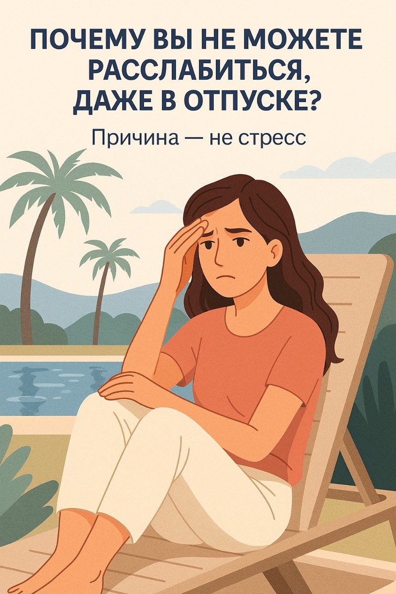 Подписывайтесь: t.me/avesol «Я на море. Всё спокойно. Но внутри — будто тревога под кожей». Так начинается огромное количество консультаций. Женщина работает, устаёт, потом едет в отпуск — и... не отдыхает.