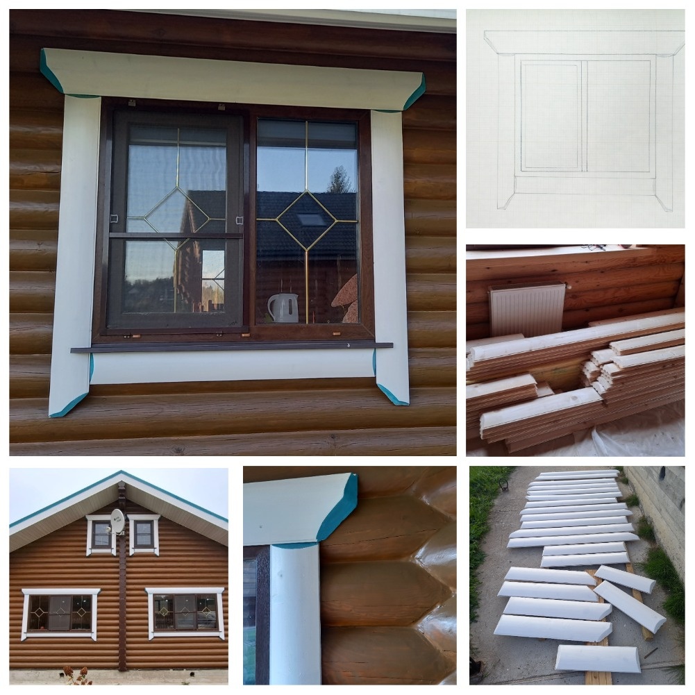Довольно долгое время у нас не доходили руки до установки наличников с внешней стороны дома. Как-то в приоритете были другие строительные работы. То первоэтапно полы надо сделать в доме, то плитку уложить, то территорию обустроить, то баню внутри. Так, шло время, а наличников все не было. Птицы потихоньку вытаскивали льноватин из усадочного зазора между бревном и обсадой окна. Мы заделывали, а птицы снова его вытаскивали. А наличников все не было. Если обращаться в специализированные компании, то установка наличников довольно дорогое удовольствие. И вот решили мы отважиться на это дело сами. Кое-какие представления о наличниках у меня в голове были ранее. Неслучайно еще 2022 году мы закупили для них материал: 6 шестиметровок блок-хауса из сосны шириной 20 см и 16 шестиметровок блок-хауса шириной 14 см. Но окончательно их дизайн сформировался летом прошлого (2024) года. Тогда же принялись разгребать эти длиннючие доски и приводить их в нужную форму. Началось все с эскиза. Вот так должны
