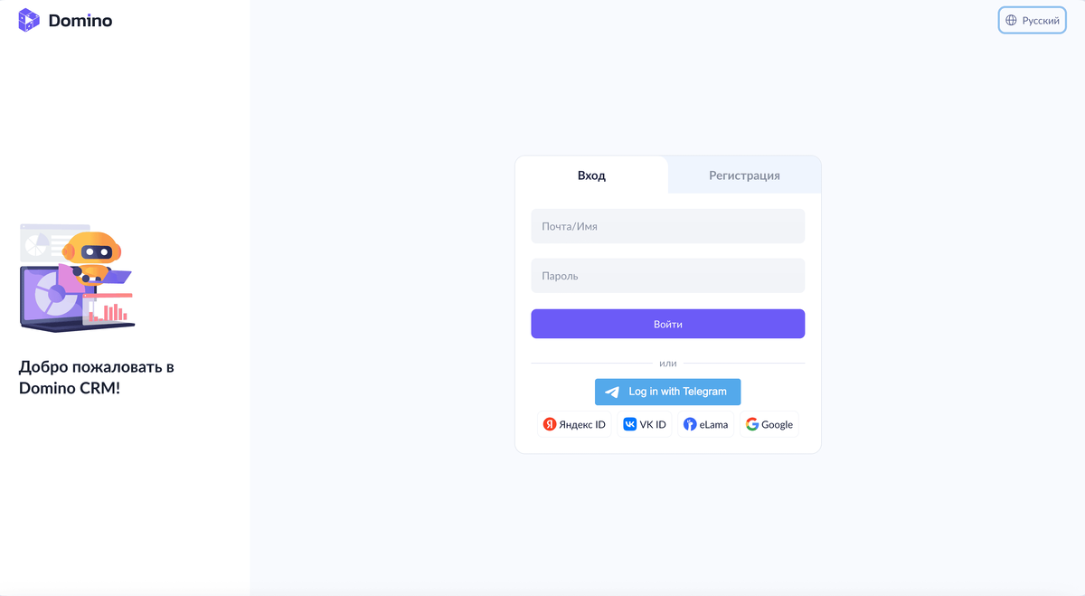 Конструктор чат-ботов Domino CRM ассоциируется с Telegram. Однако, как видно на скриншоте ниже, войти в нашу систему можно и через Yandex ID, VK, eLama и Google. При этом подчеркнем: даже если вы пользуетесь одним из этих четырех альтернативных способов, привязать мессенджер к учетке в конструкторе все же полезно. Когда Telegram не критичен
