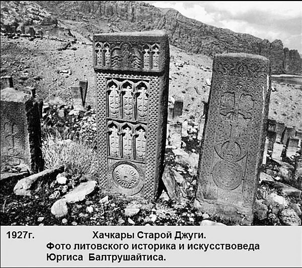 Добрались до кладбища на лошадях от ближайшей железнодорожной станции. Балтрушайтис сделал там 38 фотографий. “Все хачкары Джуги представляют собой искусство последнего периода расцвета скульптуры и являются уникальным явлением в истории мирового искусства”,- писал он.