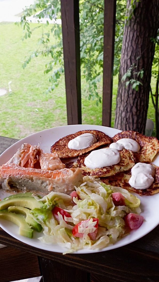 А у нас ужин готовила Оксана. Сегодня сёмга с салатом, авокадо и кабачковыми оладушками на гарнир.