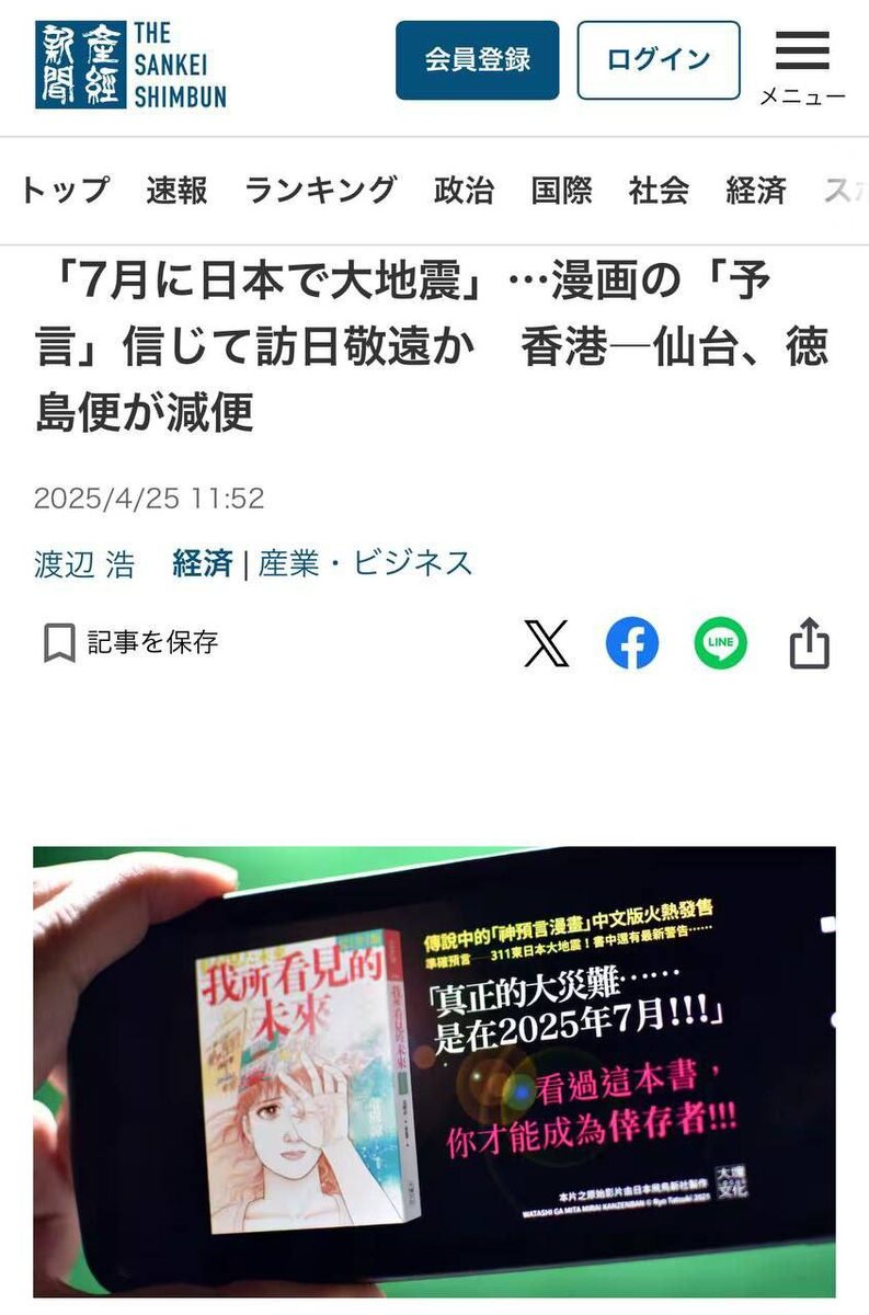 В Японии значительно сократился поток туристов из-за манги — анимешники боятся летать на самолетах и массово отменяют свои рейсы. — В 1999 году вышла манга The Future I Saw, в которой автор Рё Тацуки предсказал катастрофу в марте 2011 года. Именно тогда произошла авария на Фукусиме, унесшая почти 20 тысяч жизней. — В 2021 году вышло переиздание с новой датой: в июле 2025 года ожидается ещё одна крупная катастрофа с падением самолета. — После этого в Японии началась волна отмен авиабилетов: туристические бронирования упали на 50% (!). — Забавно, что сначала отказывались только японцы, а теперь отменяют рейсы даже иностранцы, что сильно сказалось на туризме. — В результате цены на билеты и развлечения для туристов также снизились. NeuroFlux #ИИ #Технологии #наука #нейросети #ИнтернетСвобода #ИскусственныйИнтеллект