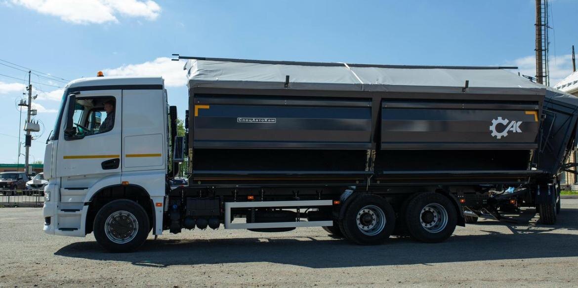 Новый автопоезд — это самосвал КАМАЗ-65658 (6х2) и самосвальный прицеп 85300А. Фото: КАМАЗ. Основным критерием при разработке автопоезда была минимизация расхода топлива при увеличении массы перевозимого груза и сохранение величины максимально допустимых осевых нагрузок. Шасси КАМАЗ-65658 предназначено для монтажа различных надстроек, оснащено двигателем КАМАЗ-689.510 мощностью 390 л.с. и кабиной шириной 2300 мм с одним спальным местом. Полная масса – 26 тонн, грузоподъёмность – 16,3 тонн, масса буксируемого прицепа – 18 тонн, полная масса автопоезда – 44 тонны. Объём самосвальной платформы автомобиля – 25,2 куб.м, объём самосвальной платформы прицепа – 26,1 куб.м. Общий объём перевозимого автопоездом груза – 51,3 куб.м. Фото: КАМАЗ. Автомобиль оснащён платформой с трёхсторонней разгрузкой для максимально возможной выгрузки в разных условиях, борта имеют резиновые уплотнители для максимальной герметичности при перевозке зерна и семечки. Передний борт цельный, жестко прикреплен к основа