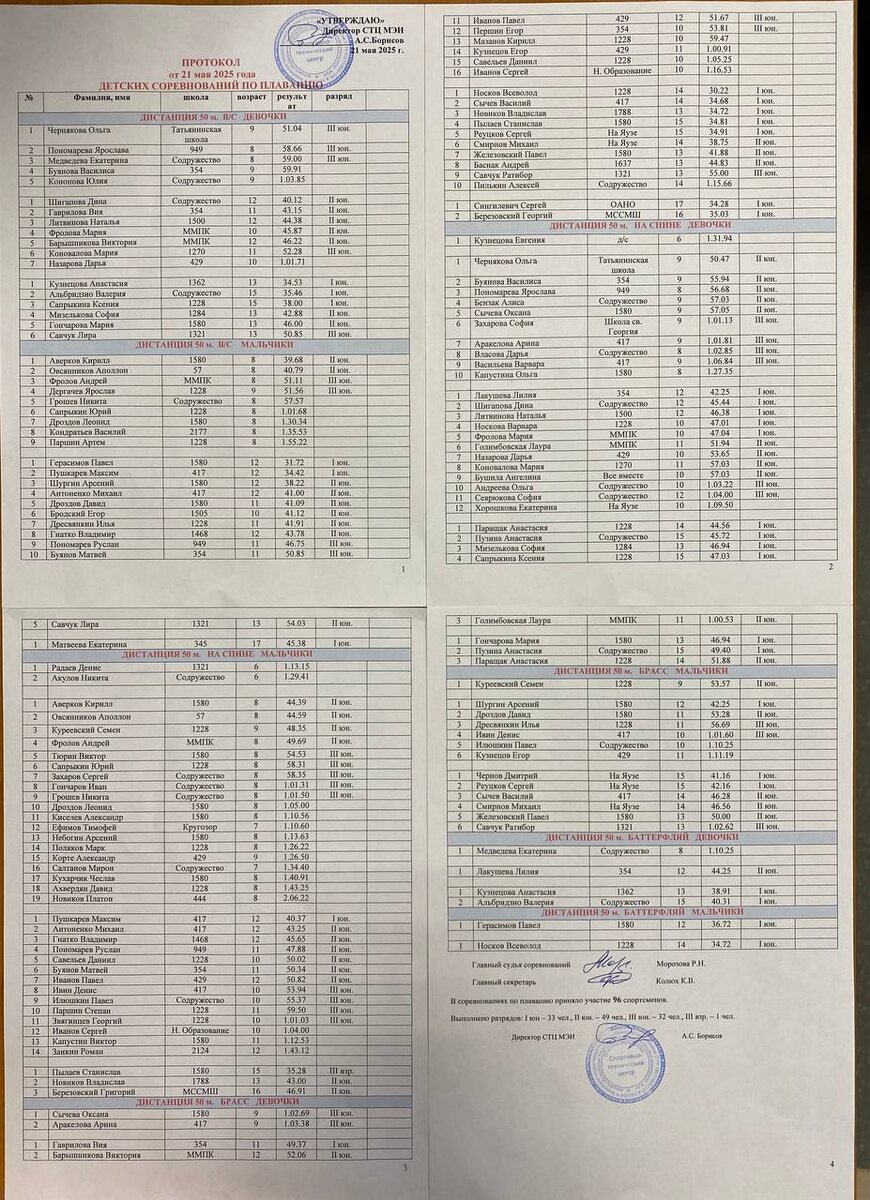 РЕЗУЛЬТАТЫ ДЕТСКИХ СОРЕВНОВАНИЙ ПО ПЛАВАНИЮ «ВЕСЕННИЕ СТАРТЫ» ✨🏆 Официальный протокол:📑✍️ В соревнованиях приняло участие 96 спортсменов! 🏊♀️🏊♂️🏊🏻 Из них 4 участника выполнили тест «УЧИМСЯ ПЛАВАТЬ»⭐️ Выполнено разрядов: III взрослый - 1 человек I юношеский - 33 человека II юношеский - 49 человек III юношеский - 32 человека 🥇✨🥈✨🥉 Для оформления новой разрядной книжки или внесения результатов соревнований в действующую разрядную книжку - пожалуйста, обратитесь к вашему тренеру 🔜🙋🏻♂️🙋🙋🏻♀️🙋♂️ 8-495-362-78-80 ❤️Ваш, СТЦМЭИ