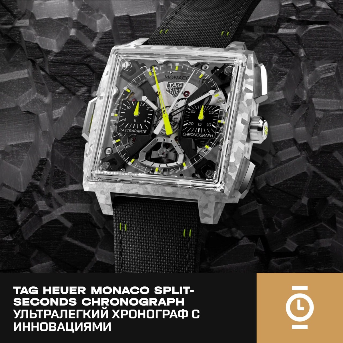 TAG HEUER MONACO SPLIT-SECONDS CHRONOGRAPH: УЛЬТРАЛЕГКИЙ ХРОНОГРАФ С ИННОВАЦИЯМИ #новость_WD TAG Heuer представила новую версию легендарного хронографа Monaco — Split-Seconds Chronograph в корпусе из запатентованного титанового сплава TH Titanium с лаймовыми акцентами. Новый сплав, разработанный в лаборатории бренда, отличается лёгкостью, прочностью и оригинальной текстурой, меняющейся при свете. Вес часов — всего 86 граммов. Корпус диаметром 41 мм покрыт чёрным DLC и дополнен сапфировым безелем. Скелетонизированный циферблат с лаймовыми деталями выполнен из сапфирового стекла. Водонепроницаемость — до 30 метров. Модель оснащена механизмом TH81-00, созданным совместно с Vaucher. Калибр TH81-00 дебютировал в 2024, и с тех пор Tag Heuer регулярно представляет новые версии своего флагманского сплит-хронографа. Это первый механический сплит-хронограф TAG Heuer, выполненный полностью из титана. Частота — 5 Гц, запас хода — до 65 часов. Ротор автоподзавода оформлен в виде щита TAG Heuer