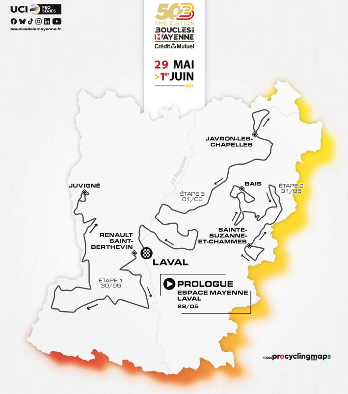 С 29 мая по 1 июня 2025 года во французском департаменте Майен пройдёт юбилейная 50-я велогонка Boucles de la Mayenne, входящая в календарь UCI ProSeries (категория 2.Pro). Это одно из ключевых событий в шоссейном велоспорте, которое соберёт сильных гонщиков и команды мирового уровня. Созданные в 1975 году, Boucles de la Mayenne прошли путь от любительских соревнований до статусной многодневки. С 2005 года гонка входила в UCI Europe Tour, а в 2014-м получила категорию 2.1, что открыло двери для команд WorldTour. С 2020 года она является частью UCI ProSeries, подтверждая свой высокий уровень. Пандемия COVID-19 привела к отмене гонки в 2020 году, но теперь организаторы готовы отметить 50-летие с размахом. В программе – праздничные мероприятия, посвящённые истории соревнования, и благодарность всем, кто поддерживает этот проект. Гонка традиционно стартует с пролога в Лавале, а затем включает три этапа с разным профилем: В этом году на старт выйдут сильнейшие гонщики, включая звезд мировог