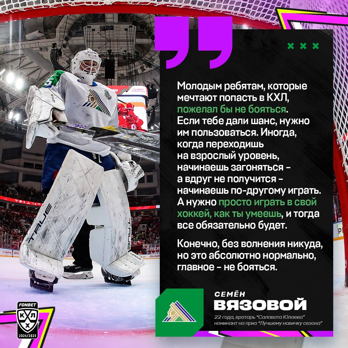 Вратарь «Салавата Юлаева» Семён Вязовой 💚 в сезоне 2024/2025 провёл 28 матчей в регулярном чемпионате, дебютировал в плей-офф и вошёл в шорт-лист номинантов на приз «Лучшему новичку» имени Алексея Черепанова. В своем монологе в рубрике «Дорогу молодым» на KHL.ru Семён рассказал о серии против «Спартака», детской мечте попасть в уфимский клуб и «Зелёном дерби».