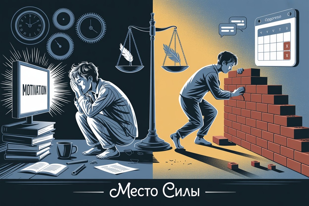 "Просто начни!" — самый бесполезный совет 21 века. Вы замечали, что после мотивационных видео хватает энергии на пару дней, а потом всё возвращается на круги своя? Дело в том, что мотивация — ненадёжный инструмент. Она зависит от настроения, уровня сахара в крови и даже погоды. В онлайн-клубе "МЕСТО СИЛЫ" выяснили: те, кто добиваются целей, вообще не полагаются на вдохновение. Разберём, почему популярные методы не работают, и что используют вместо них успешные участники нашего сообщества. 1. Почему мотивационные ролики — это ловушка?