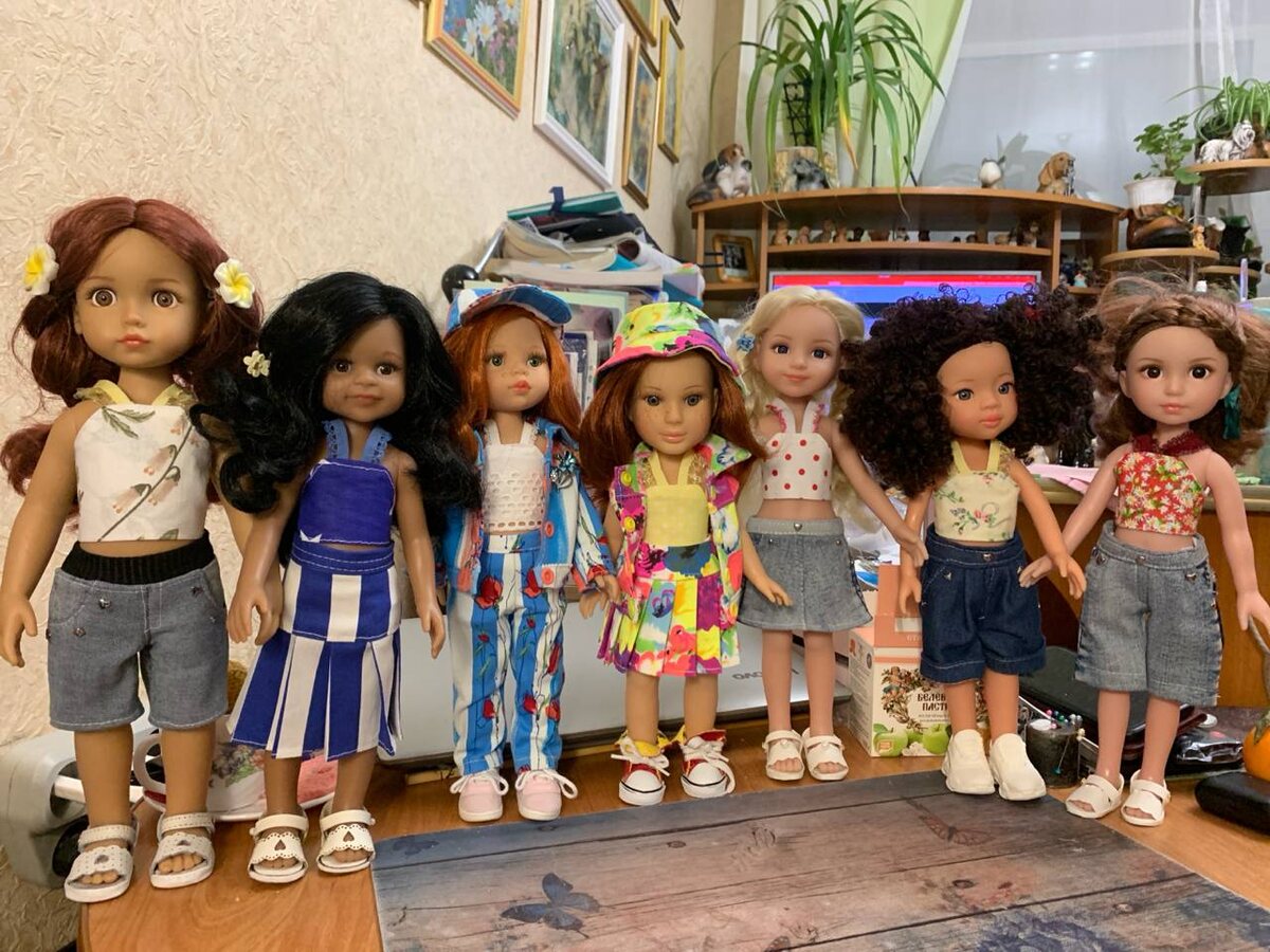 Итак, я увлеклась созданием одежды для кукол. Казалось бы, совершенно бесполезное занятие. Но, как оказалось, это только так казалось. На самом деле процесс создания даже самого простого топика связан с определёнными манипуляциями, которые заставляют мозг работать. С одной стороны, решая почти каждый день не самые простые задачи по физике, я гарантировала себе уход от таких проблем с мозгом, как деменция и слабоумие. Но лишними такие упражнения для мозга уж точно не будут. А кроме всего прочего, я не могу не радоваться результатам работы, а это положительные эмоции, как не крути. К счастью, вдохновение меня не покидает. Я придумываю новые модели и воплощаю их в жизнь. Иногда это целые серии из одного и того же материала, или одинаковая модель из разных материалов, расцветок или типов тканей. Вот эти костюмчики мне особенно нравится шить. Не знаю почему. Возможно, это материал приятный, а возможно, просто радует результат. Но костюмчики премилые получаются. Все они из р