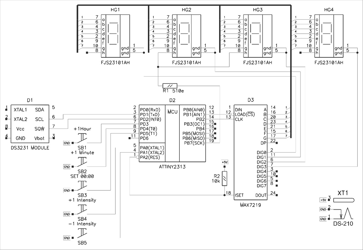 Всех приветствую! Решил на дачу сделать часы. С большими цифрами. И повесить над входной дверью. Кого сейчас удивишь электронными часами? Никого. Любой радиолюбитель однажды собирал электронные часы. Так что это заметка о том, как я сделал очередные электронные часы. Нарисовал схему: Несмотря на то, что применяется микросхема со встроенным термометром, температура отображаться не будет. Нет надобности. Индикаторы заказал самые большие, которые смог найти - 2,3". Размещаться все элементы будут на макетной плате размерами 220х100мм. Вот так: Третий индикатор устанавливается вверх ногами, чтобы можно было получить мигающее двоеточие секунд сегментами H вместо двух светодиодов. Кнопками SB1-SB3 устанавливаем время, а кнопками SB4-SB5 желаемую яркость свечения индикаторов. При проверке оказалось, что эти индикаторы светятся при напряжении 5,4в, поэтому на входе пришлось поставить небольшой повышатель напряжения SX1308. После сборки часы сразу заработали, осталось только время выставить: Мон