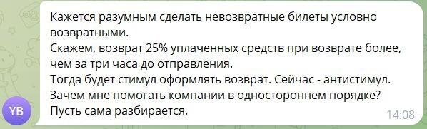 Большинство путешественников поддерживают идею сделать авиабилеты в России возвратными. Это следует из опроса Крыши. При этом многие подписчики отметили, что сейчас обладателю невозвратного билета нет смысла его сдавать, если планы меняются. Ведь за аннуляцию пассажир все равно ничего не получит. Однако, если авиакомпания в таких случаях будет возвращать хотя бы часть стоимости тарифа, ситуация изменится – перевозчик сможет заново продать место на рейс. Некоторые пользователи уверены, что такая политика избавит и от возможного овербукинга. Подробнее написали на ТурДоме.