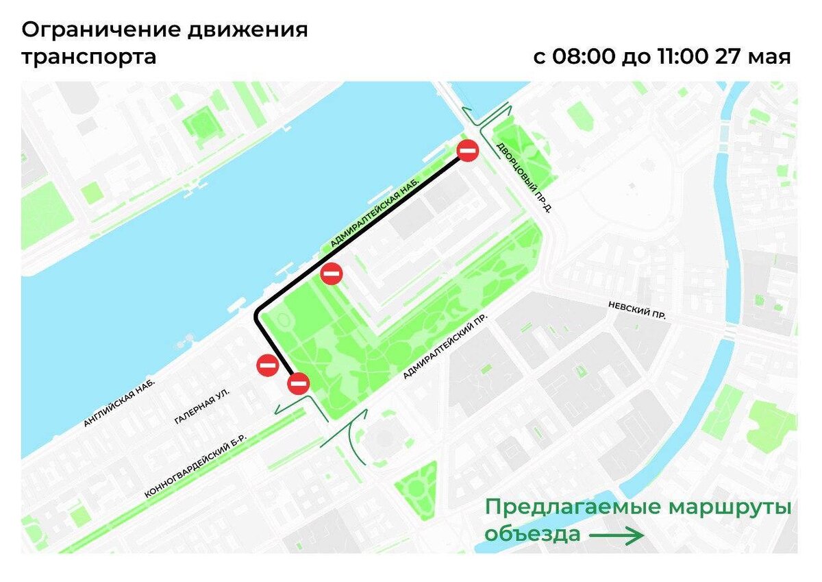 🚧 Ограничения движения в Петербурге в связи с празднованием Дня города На этой неделе в связи с мероприятиями ко Дню основания Санкт-Петербурга вводятся временные ограничения движения транспорта в Центральном и Адмиралтейском районах. 🔹 27 мая, 08:00–11:00 — ограничения на Адмиралтейской набережной и Сенатской площади из-за церемонии возложения цветов к памятнику Петру I. 🔹 30 мая, 03:00–23:30 — запрет остановки транспорта на участках Адмиралтейской набережной, Адмиралтейского проспекта, Малой Морской и Дворцовой набережной из-за шоу «Музыка Дворцового моста». 🔹 30 мая, 20:00 — 31 мая, 02:30 — полное перекрытие движения на Дворцовой и Адмиралтейской набережных, Дворцовом мосту, проезде и части Невского проспекта. 🔹 С 15 мая по 5 июня — действует запрет остановки на проездах вдоль зданий на Дворцовой площади, а 30 мая — полное ограничение движения в этой зоне из-за гала-концерта «Классика на Дворцовой». Просим учитывать ограничения при планировании маршрута. Фото: Начальник тра