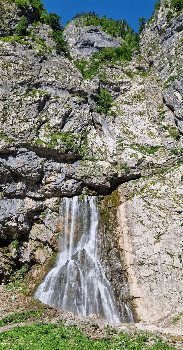 Первые 45 километров маршрута из Гагры ты едешь по асфальтовой дороге на озеро Рица. Но за 15 километров до озера указатель отправляет на гравийку очень плохого качества. И следующие 6 километров нужно ехать по ней, с трудом разъезжаясь со встречными уазиками. В полдесятого утра мы добрались до цели, отметив, что мы одни из первых. Как сказал наш гид, стандартный утренний выезд абхазских уазиков 9 утра. Они могли бы и раньше, но тогда бы возникли сложности с главной достопримечательностью местных экскурсий: дегустацией вин и сыров. Гидам пришлось бы удваивать способность убеждения и накачивать харизму, чтобы уговорить людей в 8 утра пить алкогольную сущность, называемую абхазским вином. Так что выезжают они в 9, в районе 10 «дегустируют», а на водопаде массовое прибытие разгоряченных вином и чачей туристов можно ожидать ближе к 11. В принципе позавчера в каньоне Хашупсе так всё и произошло.