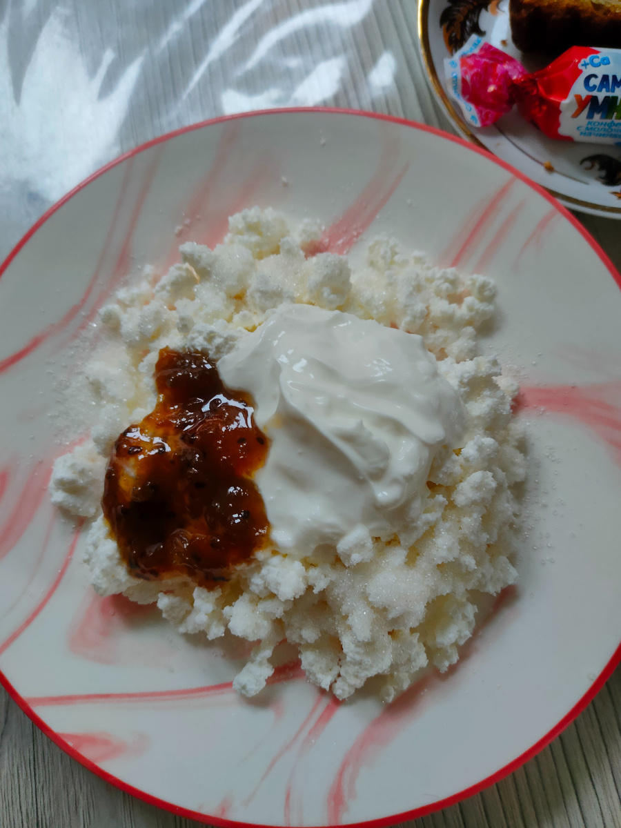 Завтрак понедельника - это творог со сметаной, сегодня я его ела с вареньем из крыжовника. Вкусно.