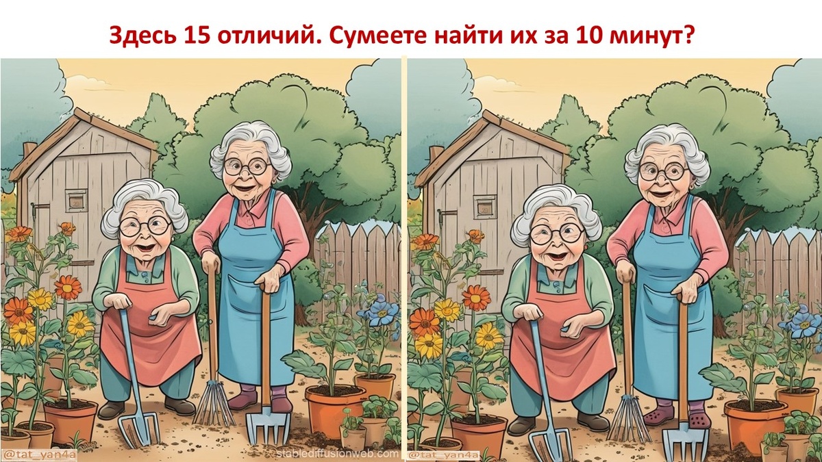 Любопытные пенсионеры постоянно пялятся на вас с соседнего участка? Ну, должно же быть у них какое-то развлечение. Вы тоже развлекитесь. Проведите время с пользой. Отыщите на этих рисунках все 15 отличий. Если сумеете сделать это за 10 минут, то вашей гениальной наблюдательности можно позавидовать. Обычному человеку на поиски этих отличий требуется минут 20. 1. "Орлиный Глаз" 👑