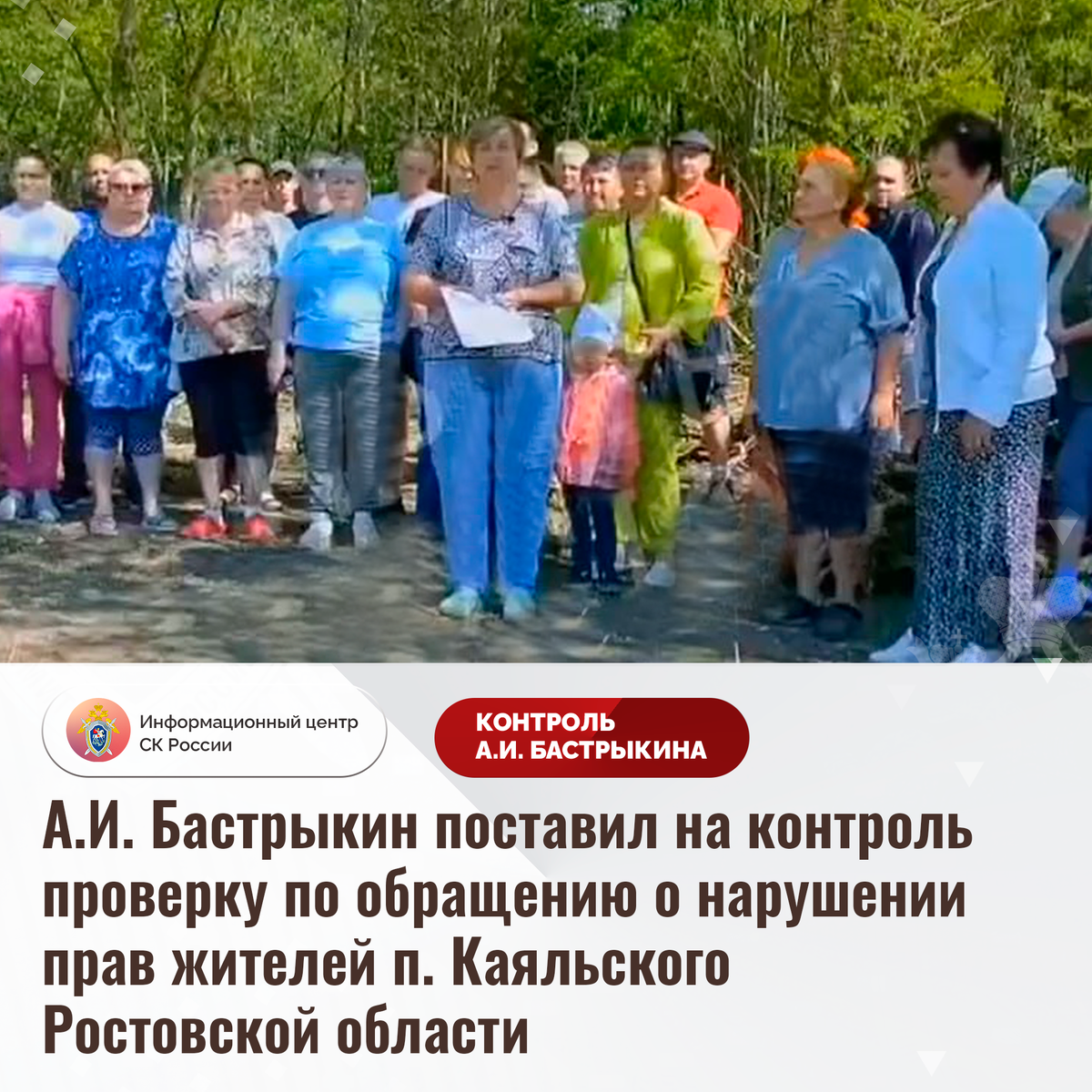 А.И. Бастрыкин поставил на контроль проверку по обращению о нарушении прав жителей п. Каяльского Ростовской области В социальной сети размещено видеообращение к Председателю СК России А.И. Бастрыкину от жителей поселка Каяльского Ростовской области по вопросу нарушения их прав. Местные органы передали в собственность частного лица земельный участок с вековыми деревьями, который не был учтен при составлении генерального плана населенного пункта. Новый владелец планирует осуществить массовую вырубку зеленых насаждений, с чем граждане не согласны и просят сохранить рощу. Ситуация освещается в социальных сетях. В СУ СК России по Ростовской области организована процессуальная проверка. Председатель Следственного комитета Российской Федерации Александр Иванович Бастрыкин поставил ход процессуальной проверки на контроль в центральном аппарате ведомства и поручил руководителю СУ СК России по Ростовской области Аслану Гаруновичу Хуаде представить доклад о ее промежуточных результатах и принятом