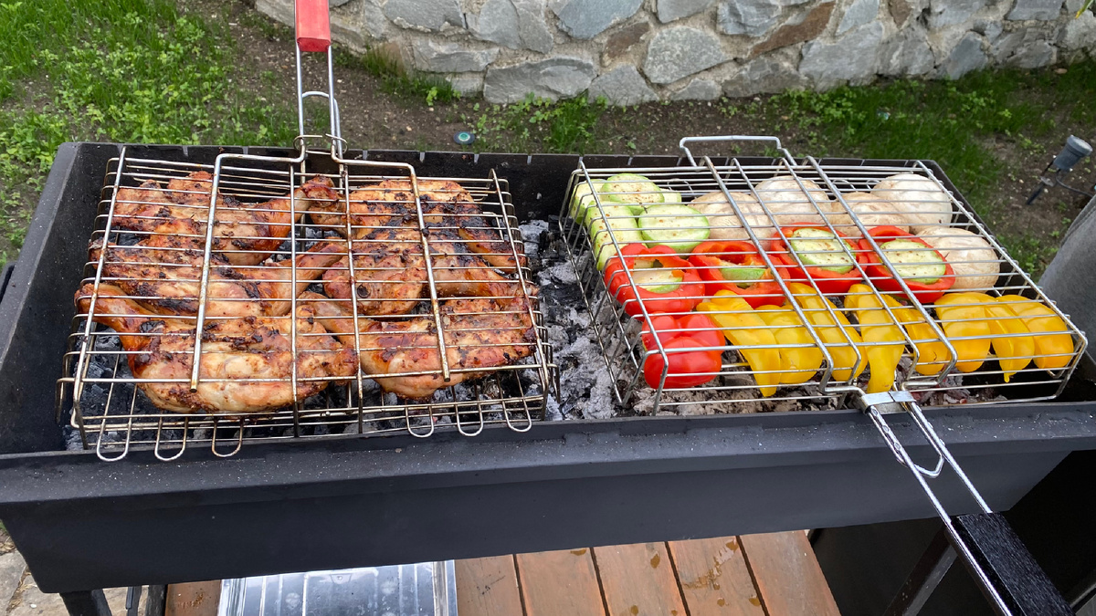 Шашлык из окорочков - простой рецепт . Плюс овощи на мангале .
