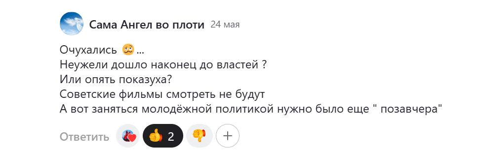 Обещала посмотреть, что пишут в комментариях про идею смотреть советские фильмы в школе. Обсудим)) Честно говоря, правда не понимаю, как это сделать практически. Похоже, что не я одна. Смотрим комментарии наших читателей. Спохватились, полагаю, после того, как мы воспитали поколение и не одно потребителей. Когда мы видим массу нелицеприятных примеров из жизни. Мы поняли, что что-то делаем не так и идём не тем путём, товарищи? Мнение Самой ангела во плоти- Мало того, что современным подросткам не понять ту эпоху, так еще и не понять, куда впихнуть это невпихуемое? Вот ведь вопрос, который НЕ интересует инициаторов идей. Александр Чистилин- Но самое интересное написала Ирина Бублик. Это правда про то, что все просто устали, ничего смотреть не хотят и хотят просто вырваться на свободу. Так ведь ещё и про фильм какую-то бессмыслицу она рассказывает. Сама я не смотрела, но могу предположить, что очень часто старшее поколение боится показаться несведущим в современной жизни, что ли. И пото