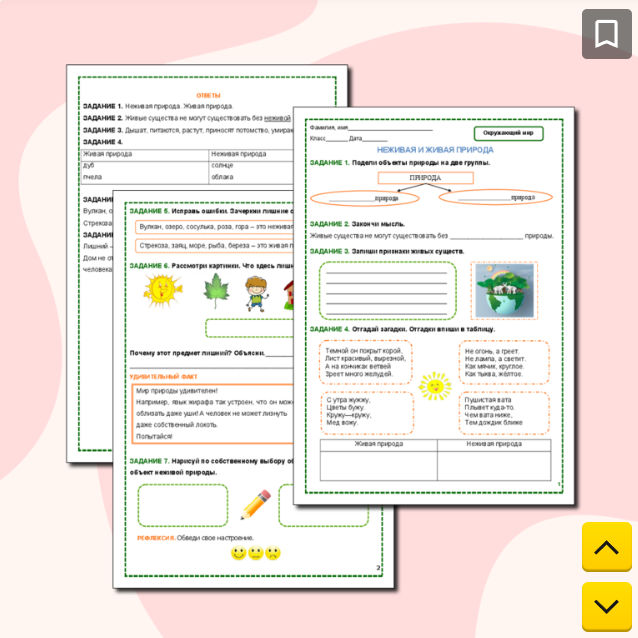 Рабочий лист состоит из 7 заданий, любопытного факта по теме урока, рефлексии и страниц с ответами. Всего три страницы: две страницы с заданиями и одна страница с ответами. Страница с ответами может быть использована учащимися для самопроверки. Задание 1. Подели объекты природы на две группы. Задание 2. Закончи мысль Задание 3. Запиши признаки живых существ Задание 4. Разгадай загадки. Отгадки запиши в таблицу (живая/неживая природа) Задание 5. Исправь ошибки. Зачеркни лишние слова. Задание 6. Рассмотри картинки. Что здесь лишнее? Запиши. Почему этот предмет лишний? Объясни. Задание 7. Нарисуй по собственному выбору объект живой природы и объект неживой природы. Рефлексия. Задания рабочего листа разнообразны, соответствуют требованиям ФГОС и будут интересны детям. В рабочий лист включен удивительный факт из мира живой природы Рабочий лист скачать здесь Желаю успехов!