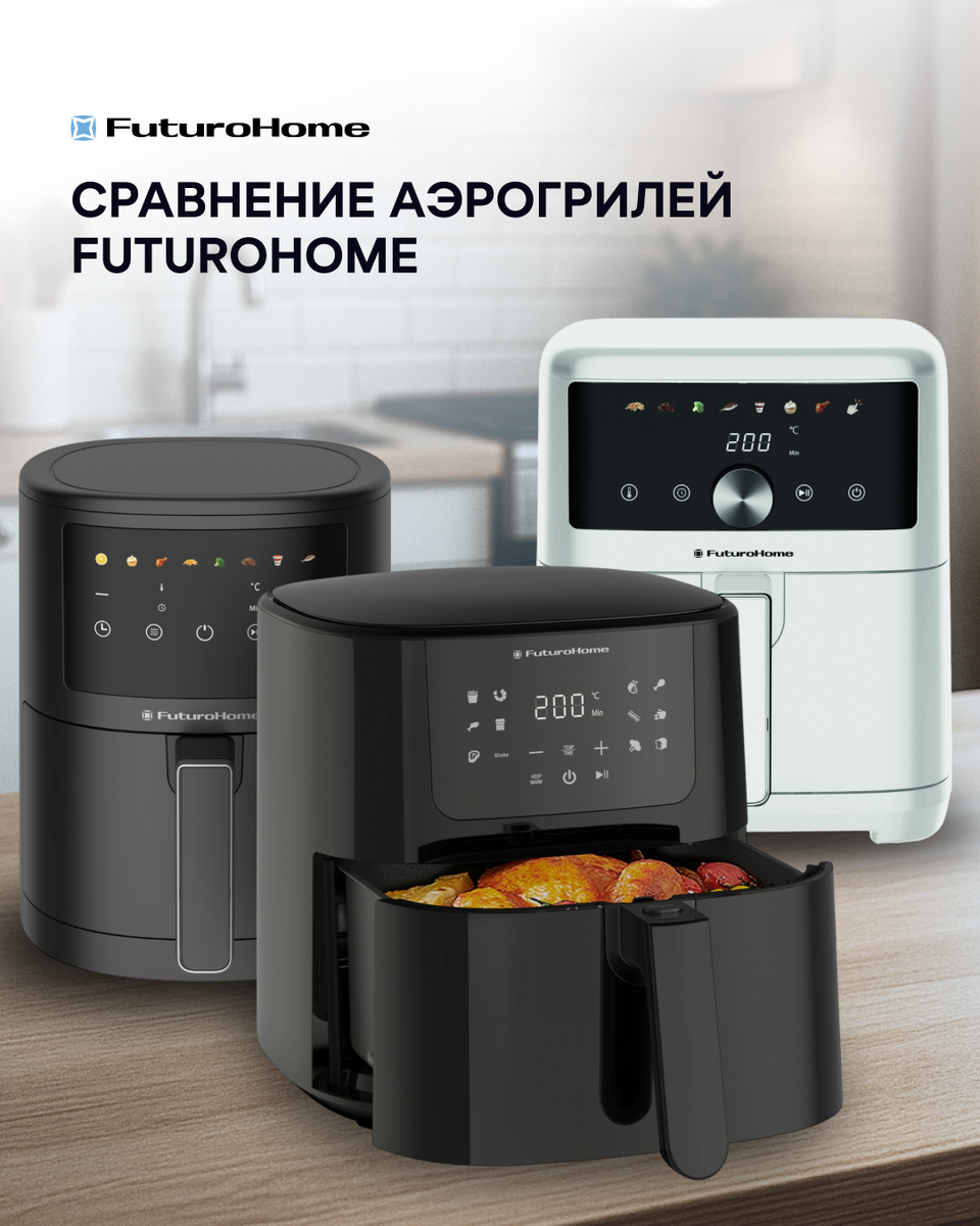 У всех аэрогрилей FuturoHome - общий принцип: быстро, удобно и без лишнего масла. Но внутри этой идеи - разные модели. Разбираемся, чем они отличаются!