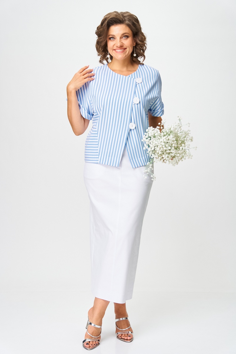 Тонкая и едва заметная полоска тоже очень модна, пример тому - этот брючный костюм в голубых тонах и платье - в сером исполнении. При желании к ним можно добавить яркие аксессуары.