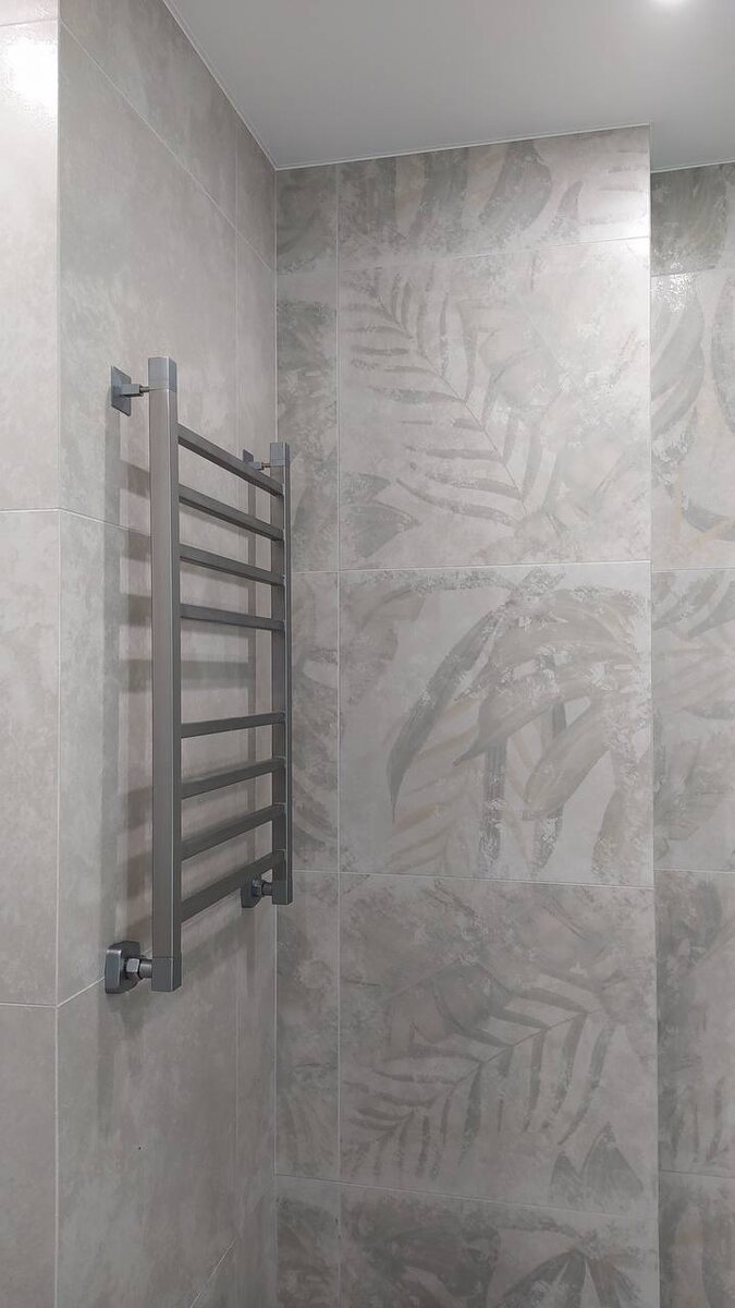 Фотографии реализованного проекта санузла💡 Две акцентных стены - в душевой и за зеркалом - мы выделили красивой плиткой с ненавязчивым растительным принтом. Остальное - фон из той же коллекции. Пол (плитка под дерево) заходит сюда из прихожей. 🚩А аксессуары, кстати, подбирали по просьбе заказчика, «матовый хром». Имейте в виду, как и в случае с золотом, оттенки и степень матовости изделий зачастую отличается у разных производителей.