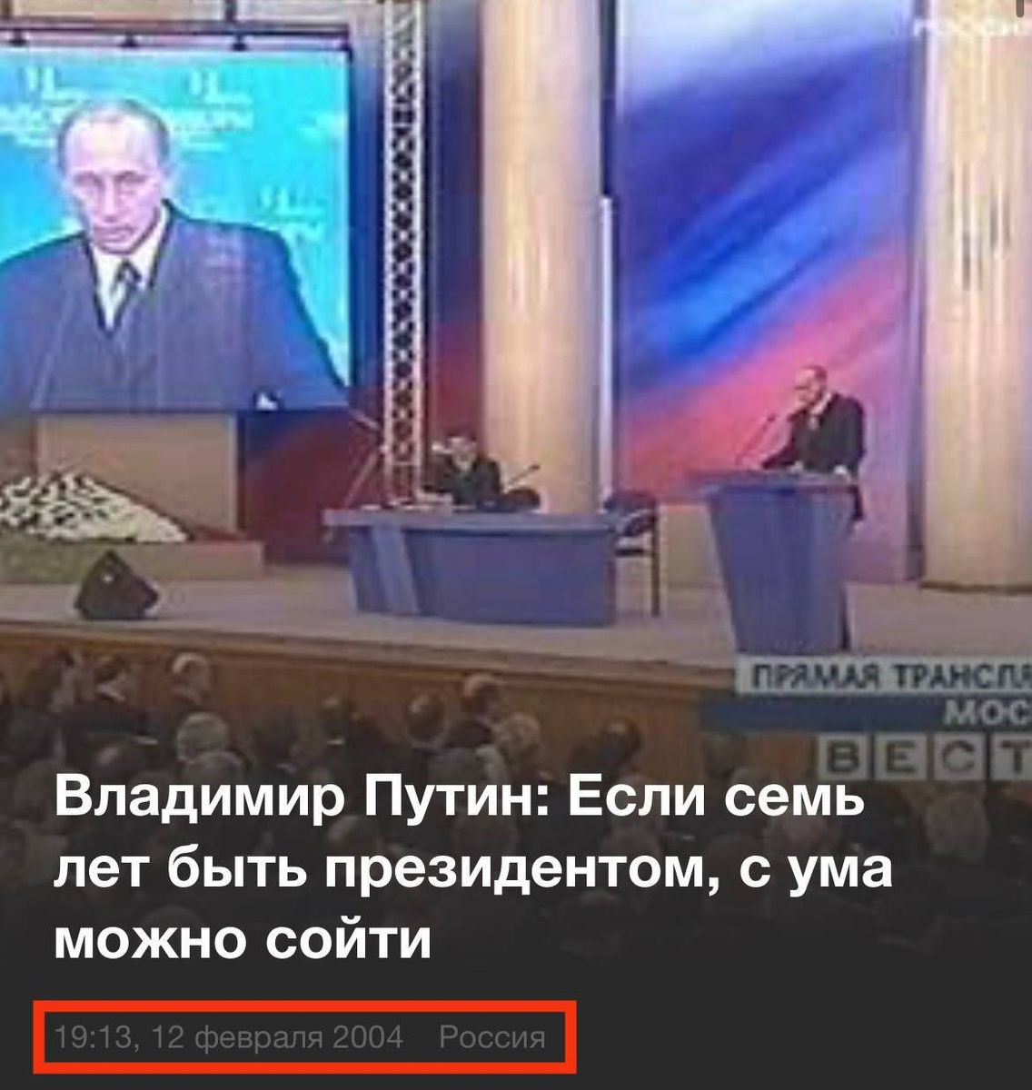 🗣Путин: "Если 7 лет быть президентом, то можно сойти с ума" ~ 12 февраля, 2004 года В тот день, на встрече с доверенными лицами, Путин раскритиковал идею увеличения срока президентства до 7 лет. Вместе с тем Путин выступал против изменения Конституции, которая предусматривала четырехлетний срок президентских полномочий: "Как только начнем проводить изменения Конституции, не остановимся. Лучше Конституцию не трогать", - считал президент России #Россия #Путин 🏛History_detail. Подписаться
