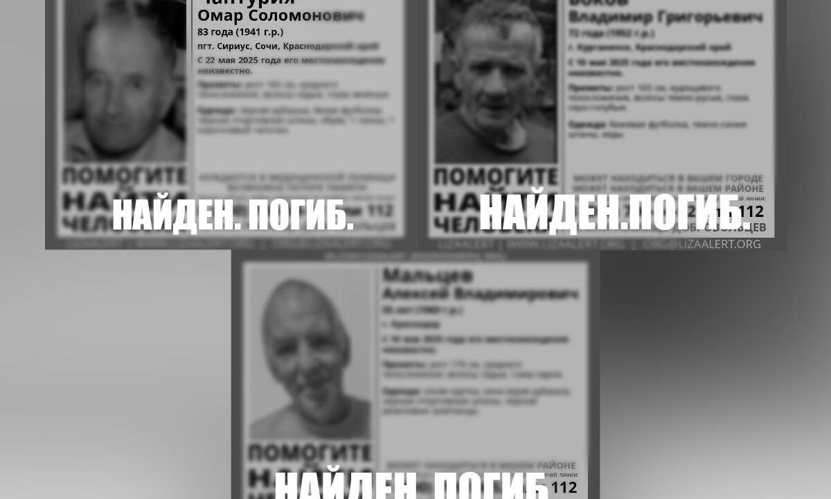 83-летнего Омара Чантурию разыскивали в «Сириусе» с 22 мая. В поисках участвовали волонтеры добровольческого поисково-спасательного отряда «Лиза Алерт» в Краснодарском крае. Уточнялось, что пенсионер нуждался в медицинской помощи и имел проблемы с памятью. К сожалению, пожилого мужчину обнаружили погибшим, об этом сообщили днем 25 мая в Telegram-канале «ЛизаАлерт». Местонахождение 72-летнего Владимира Бокова, жившего в Курганинске, было неизвестно с 10 мая. Его также разыскивали правоохранительные органы и волонтеры. Об обнаружении тела Владимира Бокова сообщили утром 26 мая. Также с 10 мая в Краснодаре разыскивали 55-летнего Алексея Мальцева. О том, что мужчину нашли погибшим, в Telegram-канале «ЛизаАлерт» сообщили днем 26 мая. Обстоятельства гибели пожилых мужчин неизвестны. Информация уточняется. Читайте также: пропавшую в Анапе пенсионерку нашли погибшей спустя месяц поисков. Речь идет о 65-летней Галине Созиновой, которая пропала без вести еще 15 апреля. Подпишись, здесь всегда ин