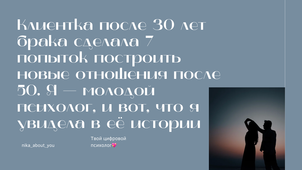 Клиентка после 30 лет брака сделала 7 попыток построить новые отношения после 50. Я — молодой психолог, и вот, что я увидела в её истории