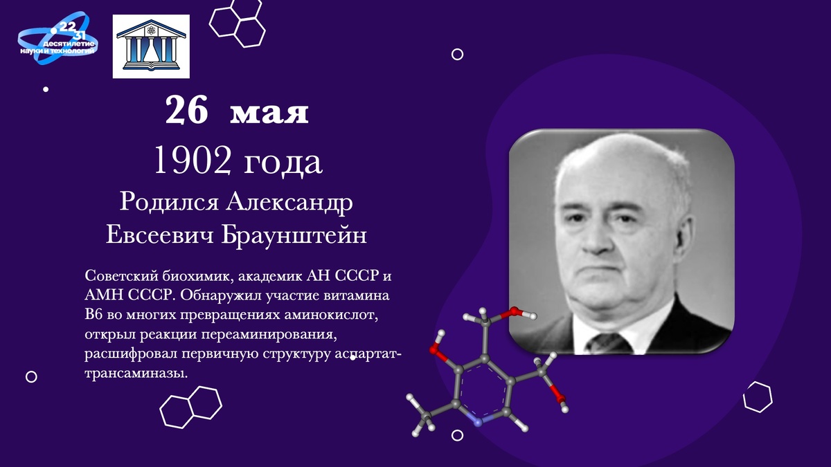 122 года назад в городе Харьков Российской империи родился будущий выдающийся советский биохимик. Нечастый случай в СССР: академик двух академий, «большой» и «медицинской», Александр Евсеевич Браунштейн (1902-1986) учился у самого Владимира Энгельгарда, работал с обоими академиками, имя которых носит современный ИБХ РАН - и с Юрием Овчинниковым, и с Михаилом Шемякиным, номинировался минимум один раз на Нобелевскую премию, и сделал очень много: открыл реакции трансаминирования (а потом установил структуру аспартат-трансаминазы), работал в области биохимии группы витаминов В6 (пиридоксин, пиридоксаль и т.п.), и много еще чего. Большая трудовая жизнь, звание Героя Социалистического Труда, три ордена Трудового Красного Знамени, Сталинская и Ленинская премии. Достойный ученый! #деньвисториихимии Материал подготовлен ИОНХ РАН для проекта «Виртуальный музей химии: продолжение осмотра» при грантовой поддержке Минобрнауки России в рамках федерального проекта «Популяризация науки и технологий»