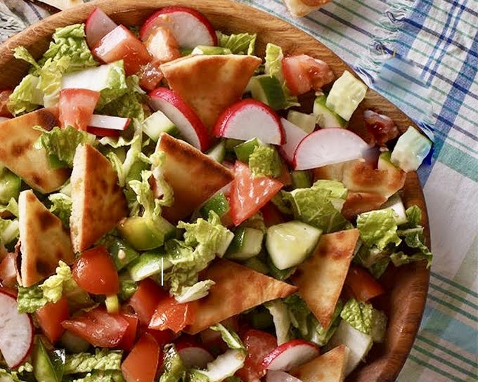 Иногда самые вкусные блюда рождаются из остаточков. Вот остался вчерашний лаваш, немного помидоров, огурец, зелень, и уже хочется собрать из всего этого что-то вкусное и сочное. Ливанцы, как никто другой, умеют превратить простые продукты в кулинарное волшебство. И салат фаттуш — как раз из таких. Он простой, хрустящий, яркий и удивительно свежий. И да, один из тех рецептов, который потом хочется готовить каждую неделю. Фаттуш — классика ближневосточной кухни. Он родом из Ливана, но его едят и в Сирии, и в Палестине, и в Иордании. В основе — свежие овощи, обильно посыпанные заатаром и заправленные щедрой ложкой оливкового масла и сока лимона. А главное — обжаренные или запечённые кусочки лаваша, которые придают салату характерный хруст и превращают его в нечто гораздо более интересное, чем просто нарезка овощей. 1. Подготовим лаваш.