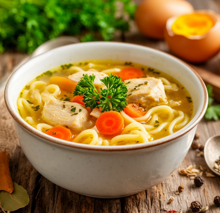 Приготовление яичного супа с курицей – это отличный способ приготовить легкий, питательный и согревающий суп для всей семьи. Для этого супа нам понадобятся следующие ингредиенты: 4 картофелины, 500 грамм курицы (можно использовать куриную грудку или бедра), 1,6 литра воды, соль по вкусу, одно куриное яйцо, 120 грамм вермишели, половина репчатой луковицы, половина моркови, 2 щепотки сушеной петрушки, один лавровый лист и одна щепотка черного молотого перца. Первым делом промываем курицу под проточной водой и выкладываем ее в кастрюлю. Заливаем курицу водой, доводим до кипения, снимаем пену и добавляем лавровый лист. Варим курицу на медленном огне до готовности, примерно 30-40 минут. Пока варится курица, очищаем картофель, лук и морковь. Картофель нарезаем кубиками или брусочками. Лук мелко нарезаем. Морковь нарезаем кружочками или полукольцами. Готовую курицу вынимаем из кастрюли и немного остужаем. Бульон процеживаем. Куриное мясо отделяем от костей и нарезаем небольшими кусочками. Воз