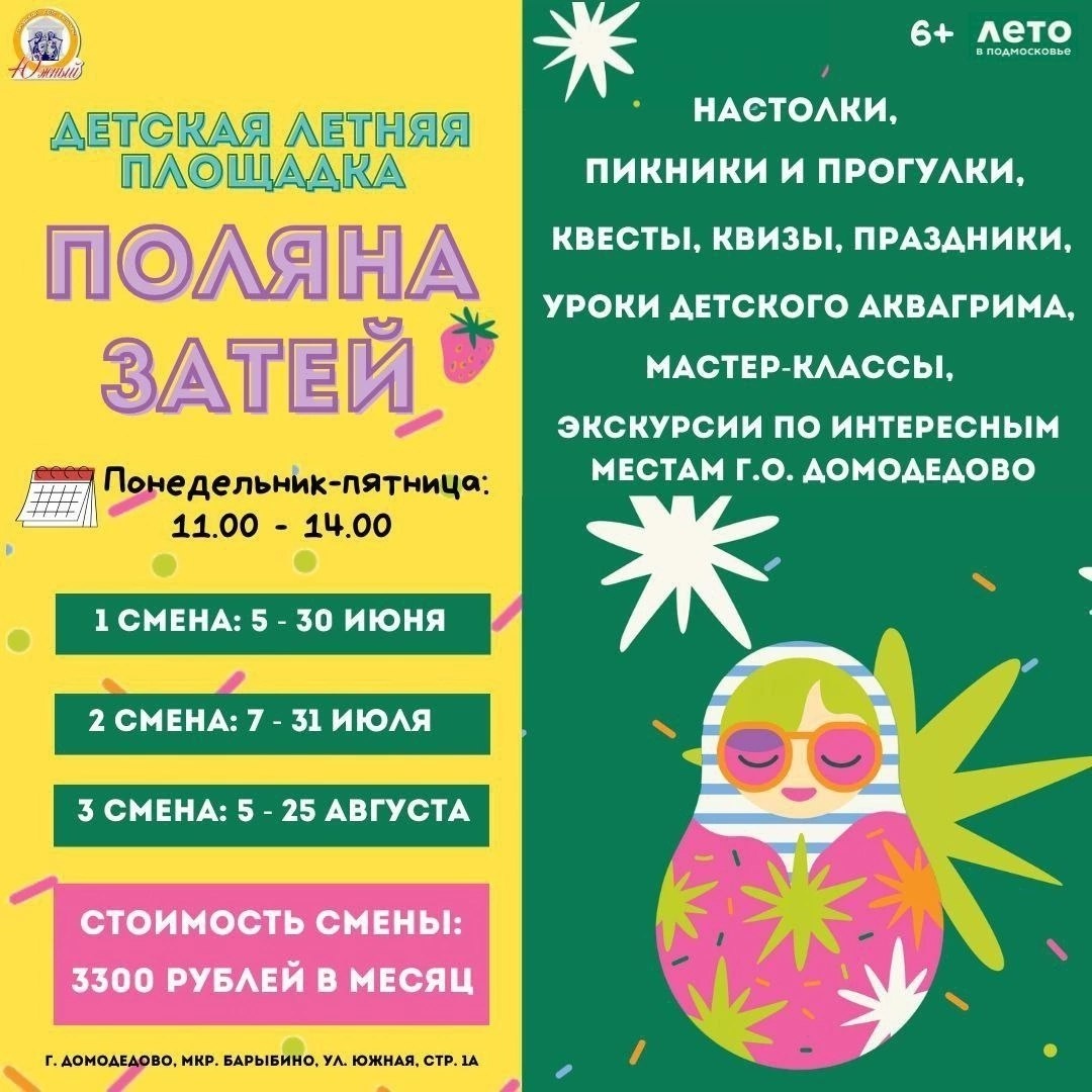 ✨ Дорогие ребята , а так же их родители! Летняя площадка в Южном это уникальная возможность провести лето с пользой☀️ Во-первых, это не скучно, творческие работники просто не дадут скучать 🤩 Во-вторых, это место, где каждый день наполнен активностями , творчеством и радостью. 🧒Площадка ждет детей от 6 до 12 лет. 📅 Смены: 1-я: 5-30 июня 2-я: 7-31 июля 3-я: 5-25 августа ⏰ Часы: Пн-Пт с 11:00 до 14:00 💰 Стоимость: 3300 рублей за смену. 🔗 Для подробностей звоните: 8-915-118-68-06 Татьяна 🚫 Возраст: 6+ 🏢 Городской дом культуры «Южный» 📍 г.о.Домодедово, мкрн.Барыбино, ул.Южная, стр1А ✅ Мероприятия Домодедово https://dzen.ru/id/66f10385cc4c5a16f7b5fb02 http://vk.com/domodedovo_events http://dzen.ru/domodedovo_events