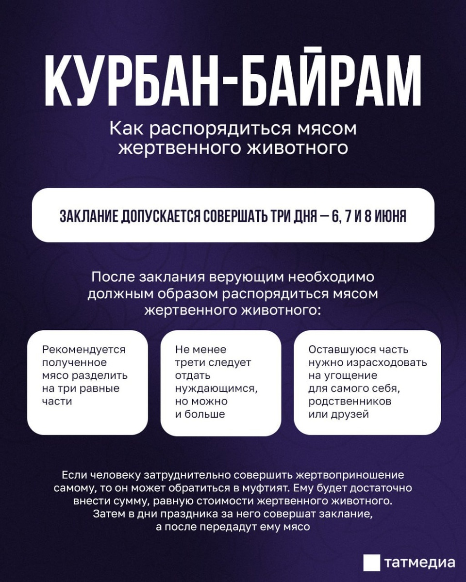 В ответ на пост 🐏❓Курбан-байрам: как правильно распорядиться мясом жертвенного животного В Татарстане 6 июня мусульмане отметят Курбан-байрам. Неотъемлемой частью этого праздника служит жертвоприношение животного. О том, как правильно распорядиться мясом, – в карточке. @tatmediaofficial