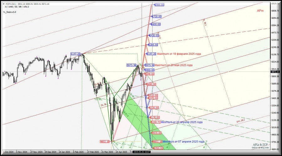 https://basechop.ru/wordpress/?p=44189 Операционный масштаб Minor (таймфрейм Daily) Основные технические уровни для торговли #SPX – Daily – обзор вариантов движения c 27 мая 2025 года. ____________________ #SPX – S&P 500 Index Фондовый индекс, в корзину которого включено 505 акций 500 избранных торгуемых на фондовых биржах США публичных компаний, имеющих наибольшую капитализацию. ____________________ Развитие движения S&P 500 Index-Daily с 27 мая 2025 года будет зависеть от отработки и направления пробоя достаточно узкого диапазона: – уровень сопротивления 5900.00 на начальной линии SSL вил младшего операционного масштаба Minute-h4; – уровень поддержки 5840.00 на верхней границе ISL61.8 зоны равновесия вил старшего операционного масштаба Minor-Daily. Восходящее движение: Пробой начальной линии SSL (уровень сопротивления 5900.00) вил младшего операционного масштаба Minute-h4, с последующим пробоем maximum 5973.36 от 20 мая 2025 года, определят дальнейшее развитие восходящего …