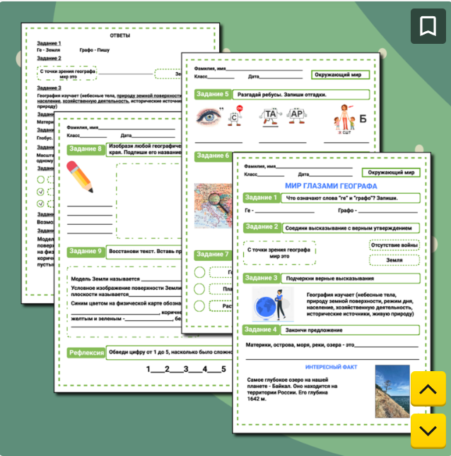 Рабочий лист состоит из 9 заданий, рефлексии и страницы с ответами. Всего 4 страницы: 3 страницы с заданиями и 1 страница с ответами. Задание 1. Расшифруй слова Задание 2. Соедини высказывание с верным утверждением Задание 3. Подчеркни верные высказывания Задание 4. Закончи предложение Задание 5. Разгадай ребусы Задание 6. Запиши, что показывает масштаб на карте Задание 7. Отметь галочкой неверные ответы Задание 8. Изобрази географический объект своего края Задание 9. Восстанови текст Рефлексия на основе числового ряда Задания рабочего листа разнообразны, соответствуют требованиям ФГОС , являются хорошим подспорьем учителю и интересны детям . В рабочий лист включен любопытный факт об озере Байкал, что позволяет учителю выйти за рамки учебника и организовать актуализацию знаний учащихся об известных им географических объектах. Задание № 8 нацелено на связь темы урока с краеведением, что актуально для современного урока. Рабочий лист скачать здесь Желаю успеха!