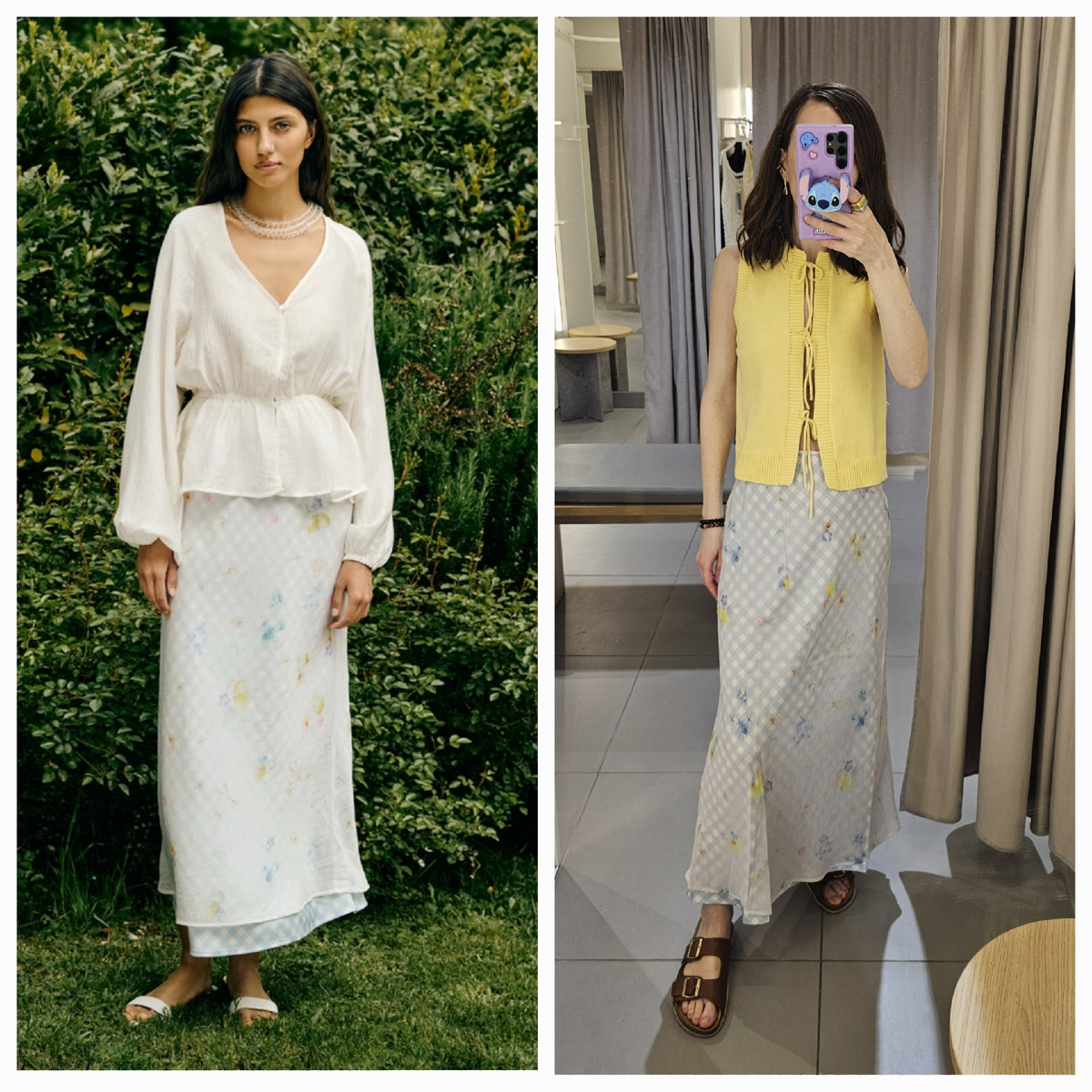 В этот раз Зарина в основном порадовала достойными внимания трендовыми и базовыми летними вещами. Но были в примерке и очень неудачные модели. Сегодня покажу и то, и другое как выглядит на моделях на сайте бренда и как на мне. Юбка ZR2506033503. Визуально очень классная юбка: отличная идея с двумя слоями с разными, но сочетающимися принтами. В жизни цвета ярче, и это прям отлично- на сайте она довольно бледная. Сядет хорошо на многих- талия на резинке: при небольшой разнице объемов талии и бедер чуть добавляет объёма в бедрах и делает красивый изгиб, при большем перепаде тоже все будет ок. Но есть минус: верхний слой сделан из тенселя с 20% полиамид, а нижний- из полиэстера. Был бы низ из вискозы- идеально было бы. На мне размер XXS Жилет ZR2506033302 Трендовый, хлопковый, очень позитивного цвета (тоже в жизни ярче, чем на модели показан). Носить можно практически с чем угодно: с льняными брюками, джинсами, шортами, юбками (джинсовыми, льняными, атласными)- мне вот очень понравился о