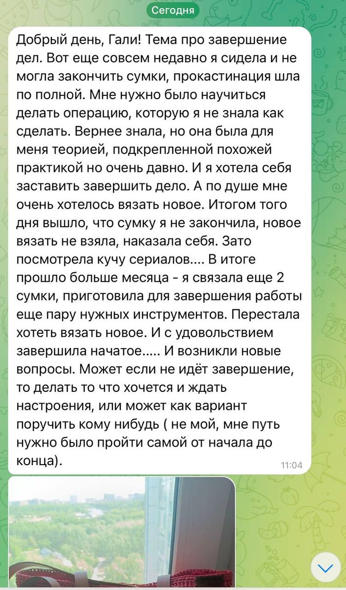 Лена, @Elena_v_ryabova спасибо за твои вопросы. Они всегда дают почву для размышлений. И твой вопрос в продолжение темы, которую я днём начала обсуждать. Мы все разные. Ответ ⬇️⬇️⬇️ официальный 😂 неофициально уже ответила в переписке. ————————— Понимаю ситуацию и размышления! Главное открытие здесь в том, что ты уже нашла свой ритм - сейчас тебе хочется завершать, а не начинать новое. Это нормально и ценно! Мой совет Елене и другим, кто мучается прокрастинацией: 1. Не боритесь с естественными циклами - если сейчас энергия идёт на завершение, используйте это! Доделывайте «сумки»/что-то другое с удовольствием. 2. Про новую «операцию»/задачу - раз инструменты готовы, но желания нет, можно: - Отложить спокойно до следующей "фазы начинаний" - Или встроить изучение микродозами в процесс завершения сумок (5 минут в день, без давления) 3. Те два месяца не были потрачены зря - ты отдохнула, подготовилась, и теперь у тебя есть энергия на завершение. Это часть процесса! 4. Не наказывать с